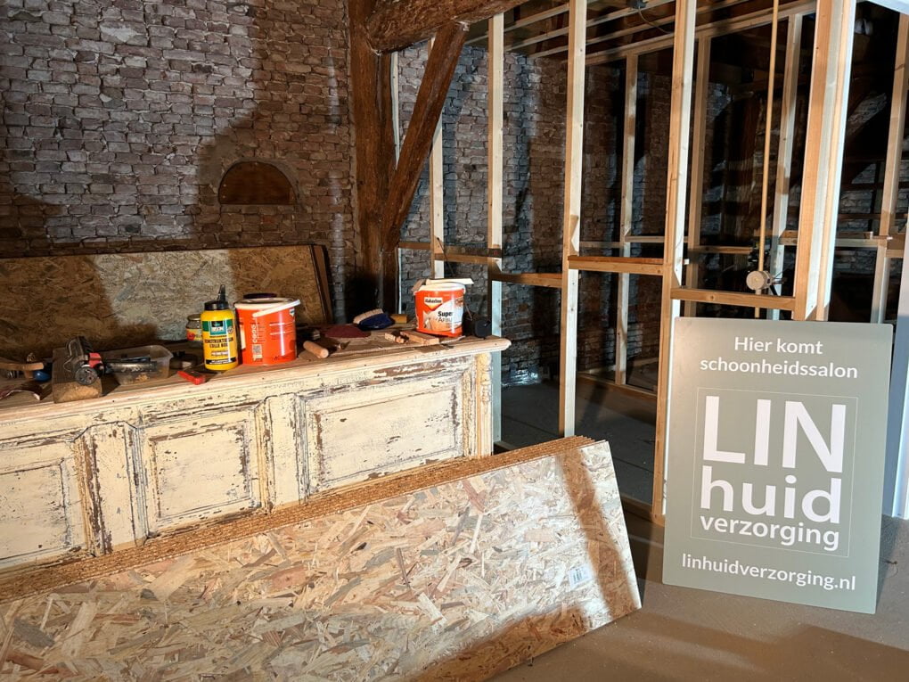 Op dit moment zijn we druk bezig met het bouwen van de nieuwe salon in Uppel (Almkerk). De frames voor de wanden van ontvangstruimte, behandelruimte en opslag worden geplaatst. De nieuwe toonbank staat zelfs al op z’n plaats al moet deze nog wel een likje verf krijgen.